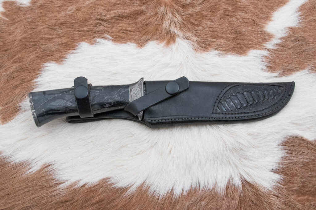Rukojeť je vyrobena ze stabilizovaného mamutího klu, které poskytuje pevný a pohodlný úchop, a zároveň se pyšní pěknou strukturou, která dodávají noži jedinečný estetický charakter.