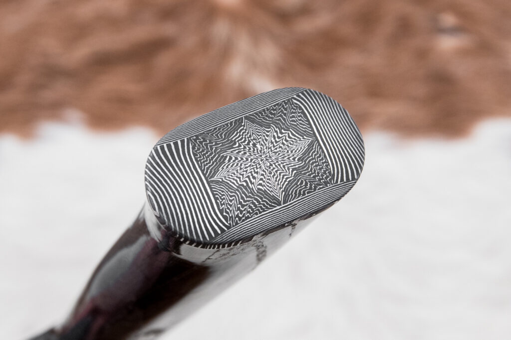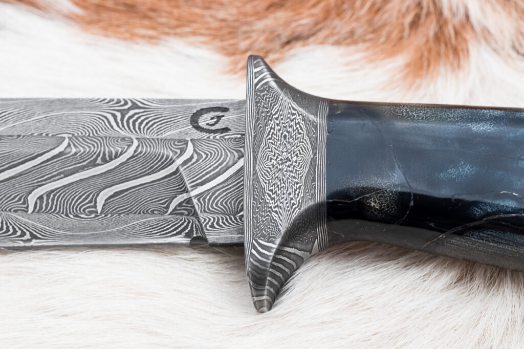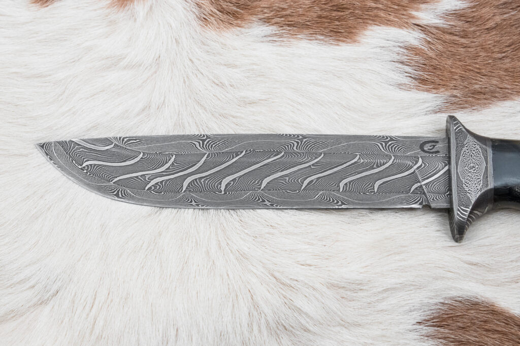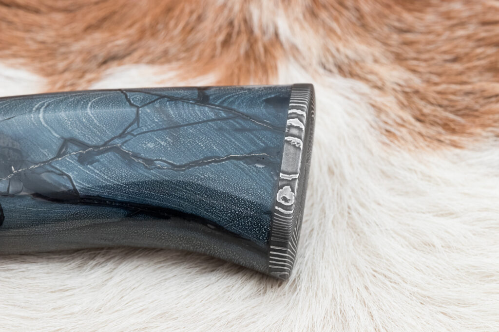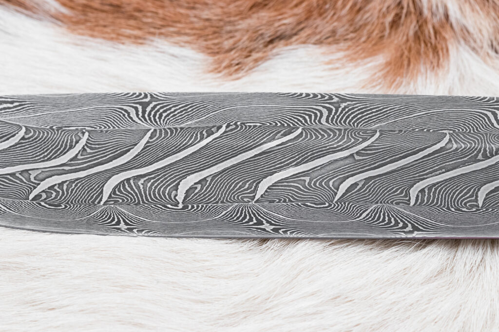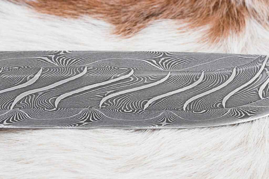 Čepel o délce 161 mm, vyrobená ze tří různýchprutů torzní damaškové oceli (19312 a 75ni8), zajišťuje výjimečnou ostrost, pevnost a dlouhou životnost. Povrch čepele zdobí jednotlivé vrstvy kování damašku, která dodává noži jedinečný a neopakovatelný vzhled inspirovaný tradičními kovářskými technikami.