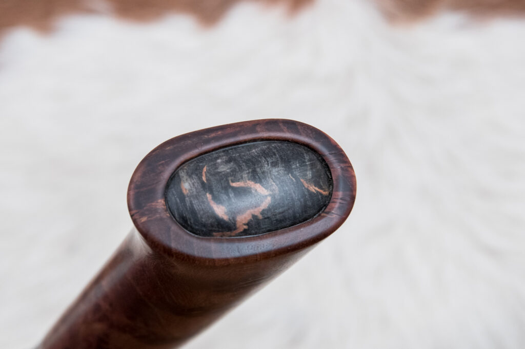 Rukojeť je vyrobena z ebenového dřeva a stabilizovaného jilmu, které poskytuje pevný a pohodlný úchop, a zároveň se pyšní pěknou strukturou, která dodávají noži jedinečný estetický charakter.