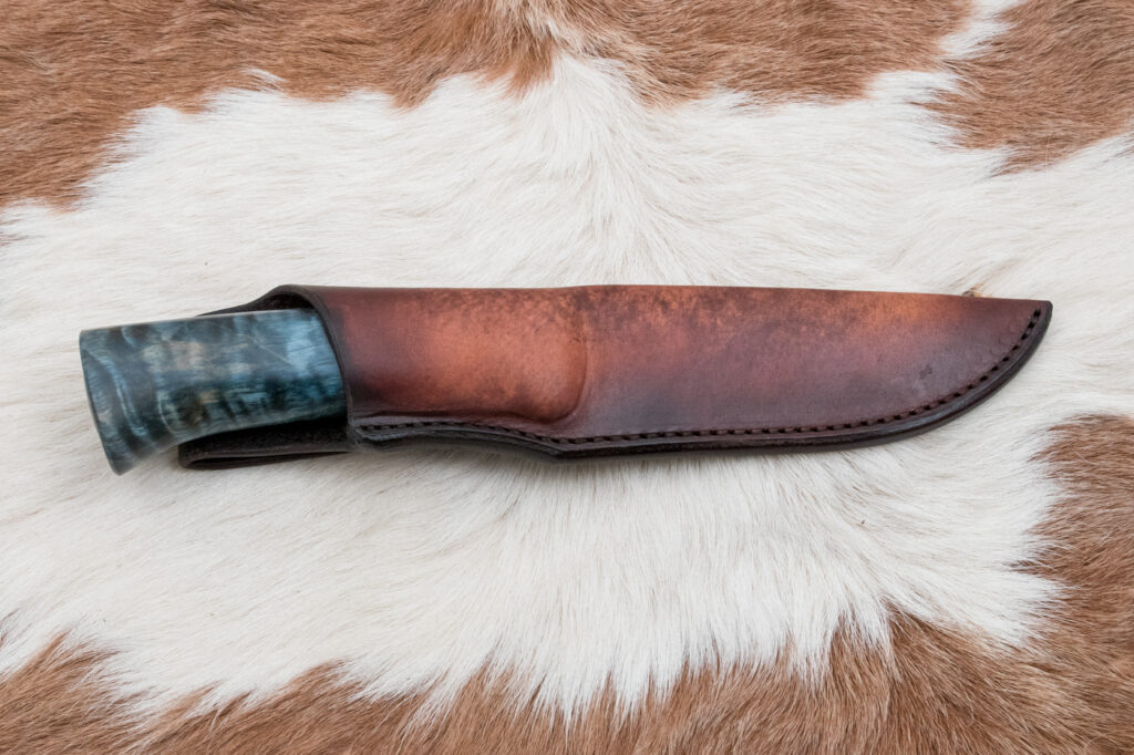 K noži patří pouzdro z na miru tvarované hovězí kůže kryjící čepel nože. Nůž je v pouzdře zajištěn vylisováním na nůž. K uchycení pouzdra na opasek slouží zahnuté a prošité poutko.