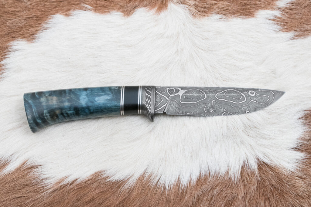 Ručně kovaný damaškový nůž 809 klasického tvaru. Poslouží na jemnější práci, ale snese i hrubší zacházení. Damascenký nůž který oceníkaždý milovník přírody.