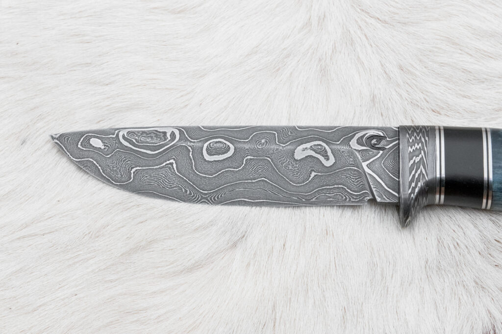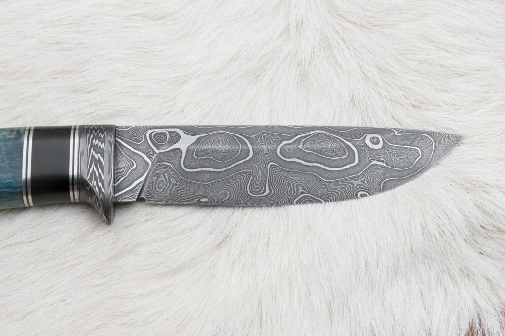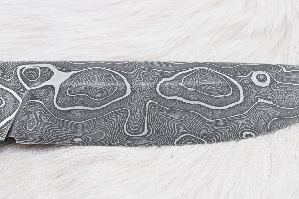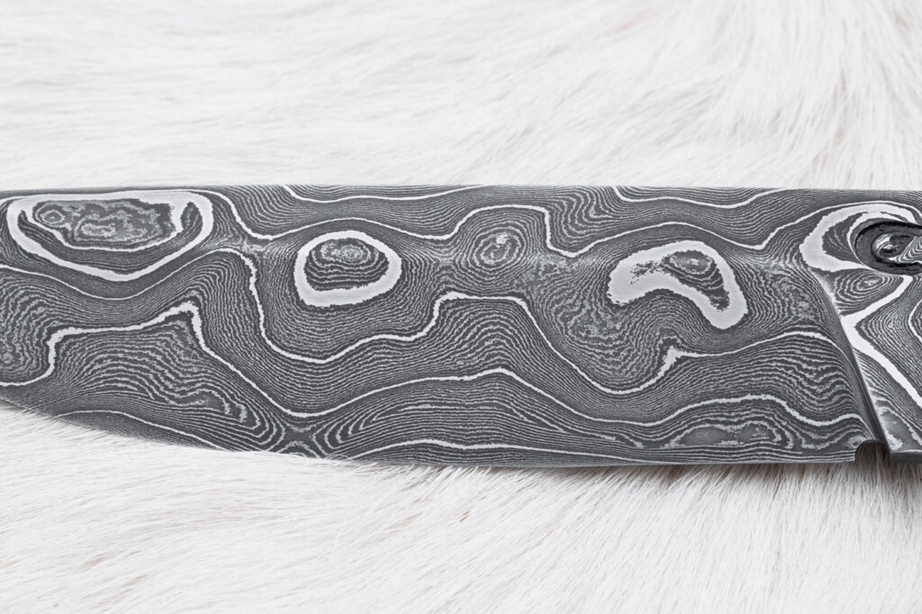 Čepel je z damascencké oceli kované ze 400 vrstev. kaleno na 60 HRC. Na hřbetu je síla čepele 3.6 mm. Povrch čepele damašek.