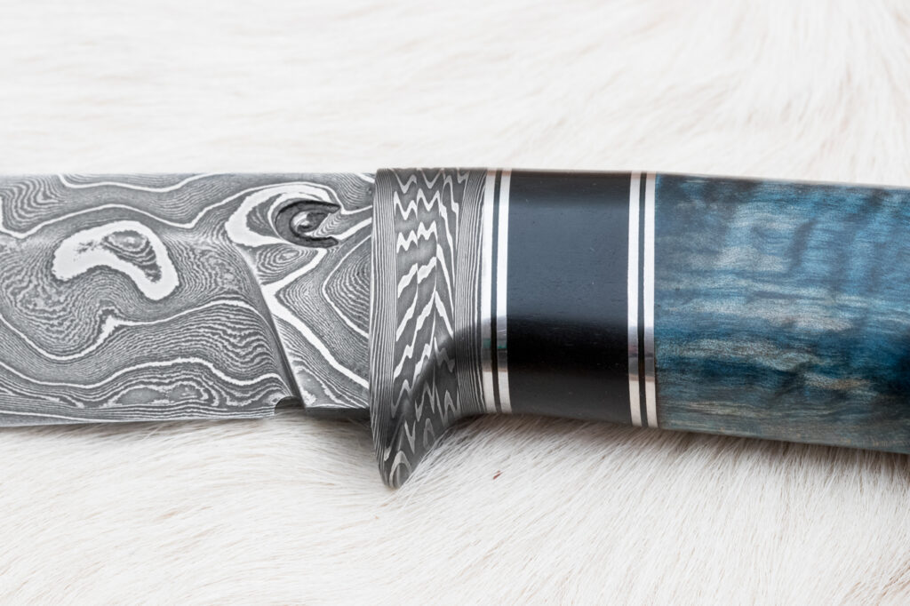 Rukojeť je vyrobena ze stabilizovaného dřeva javoru a ebenu. Záštita je z damaškové mozaiky za záštitou jsou vložky z nerez oceli a fíbru.