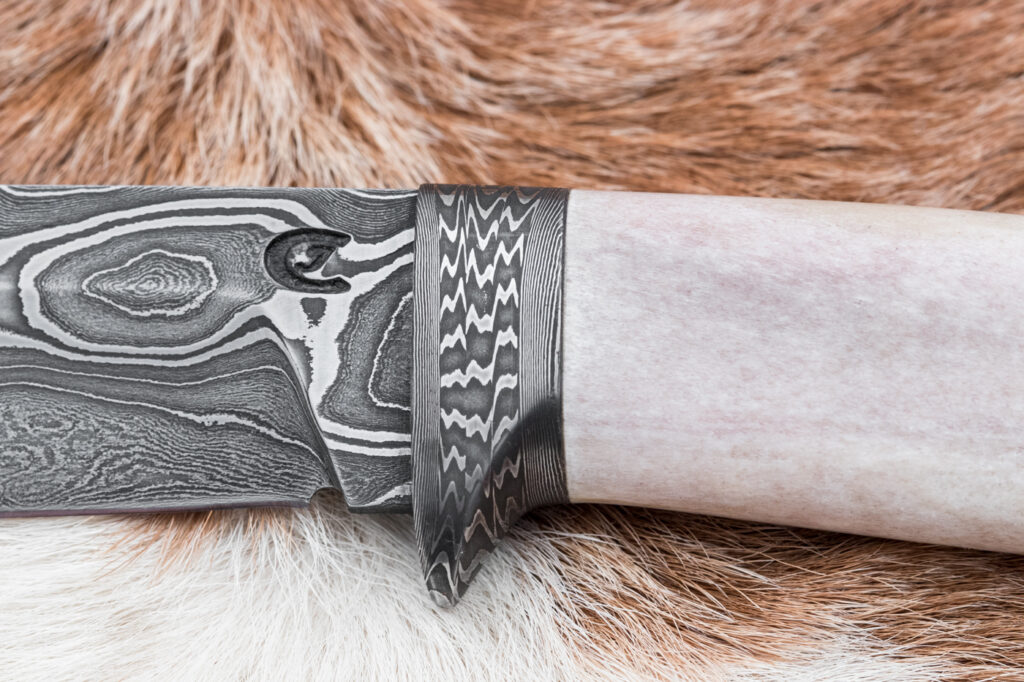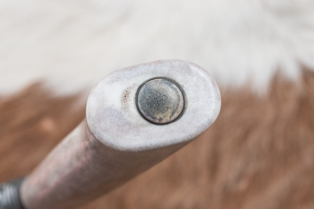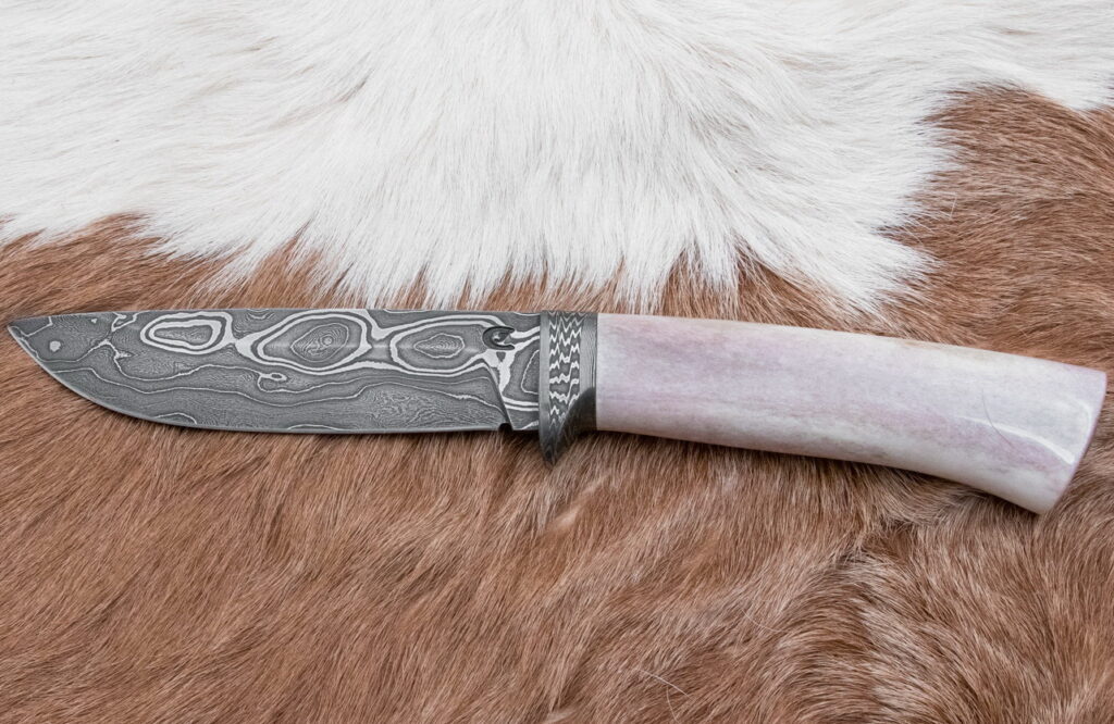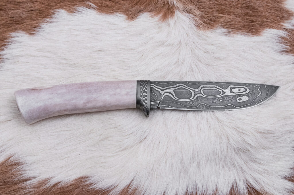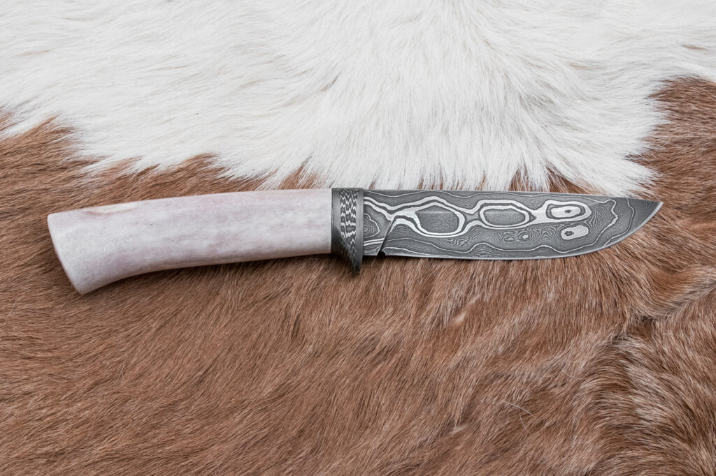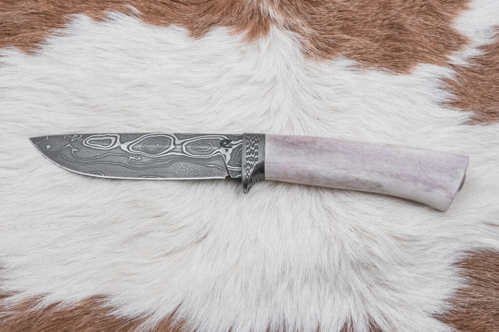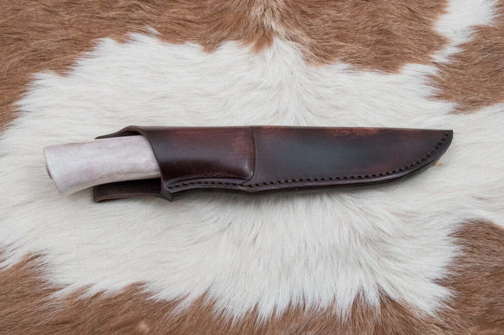 Rukojeť je vyrobena z leštěného sobího parohu, které poskytuje pevný a pohodlný úchop, a zároveň se pyšní pěknou strukturou parohu, která dodávají noži jedinečný estetický charakter.