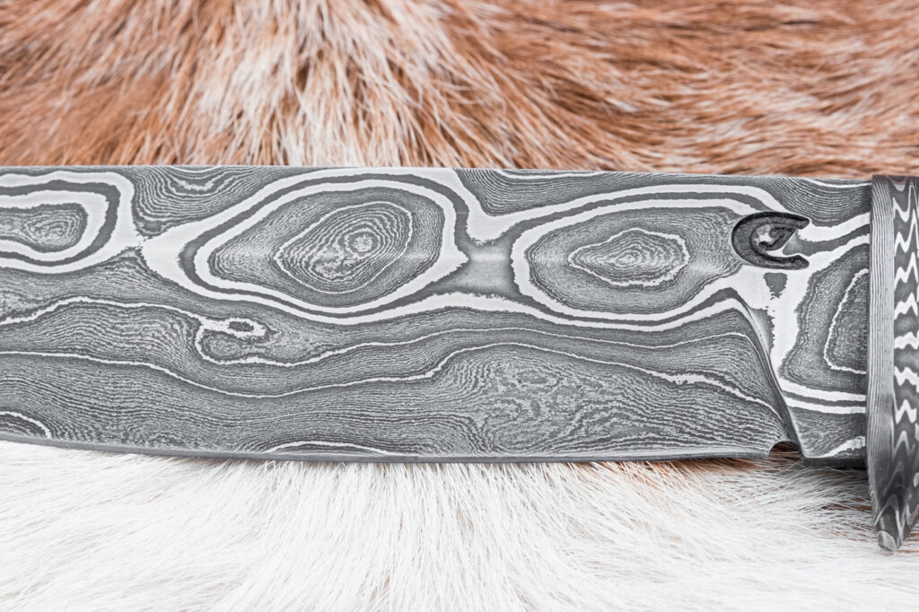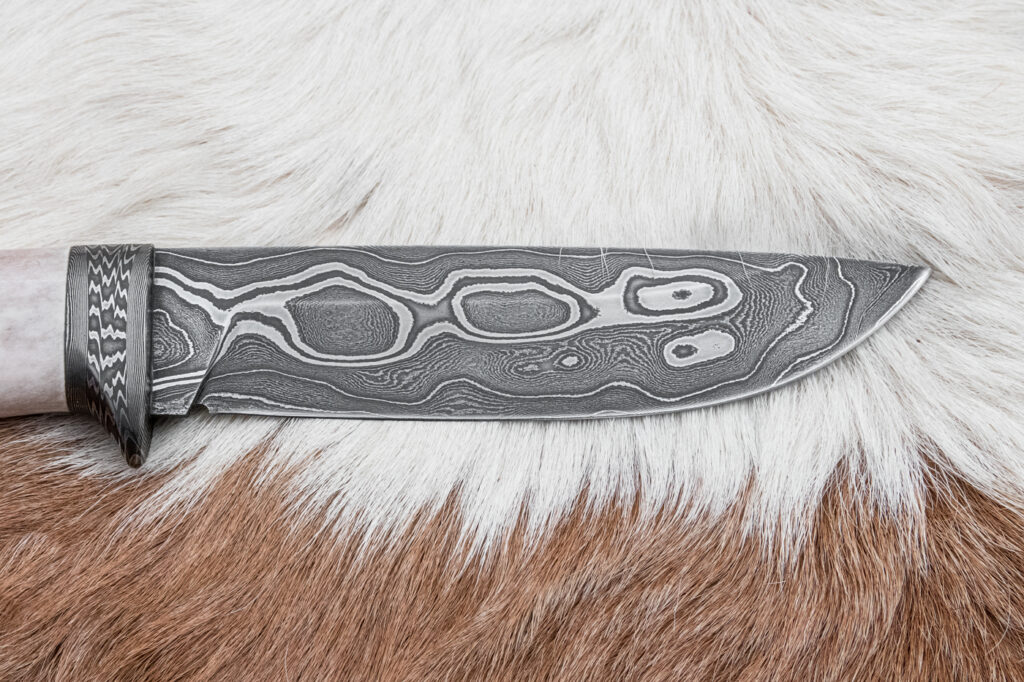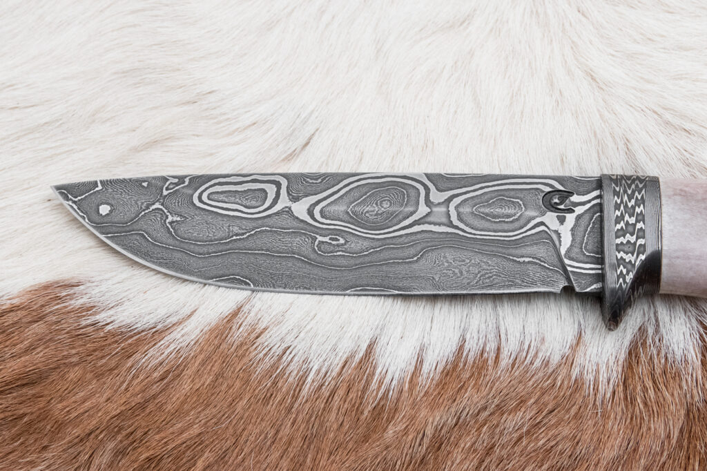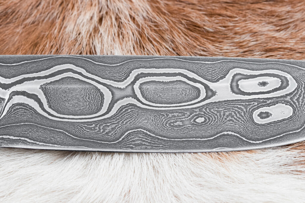 Čepel o délce 125 mm, vyrobená ze 400 vrstev překládané damaškové oceli (19312 a 75ni8), zajišťuje výjimečnou ostrost, pevnost a dlouhou životnost. Povrch čepele zdobí jednotlivé vrstvy kování damašku, která dodává noži jedinečný a neopakovatelný vzhled inspirovaný tradičními kovářskými technikami.